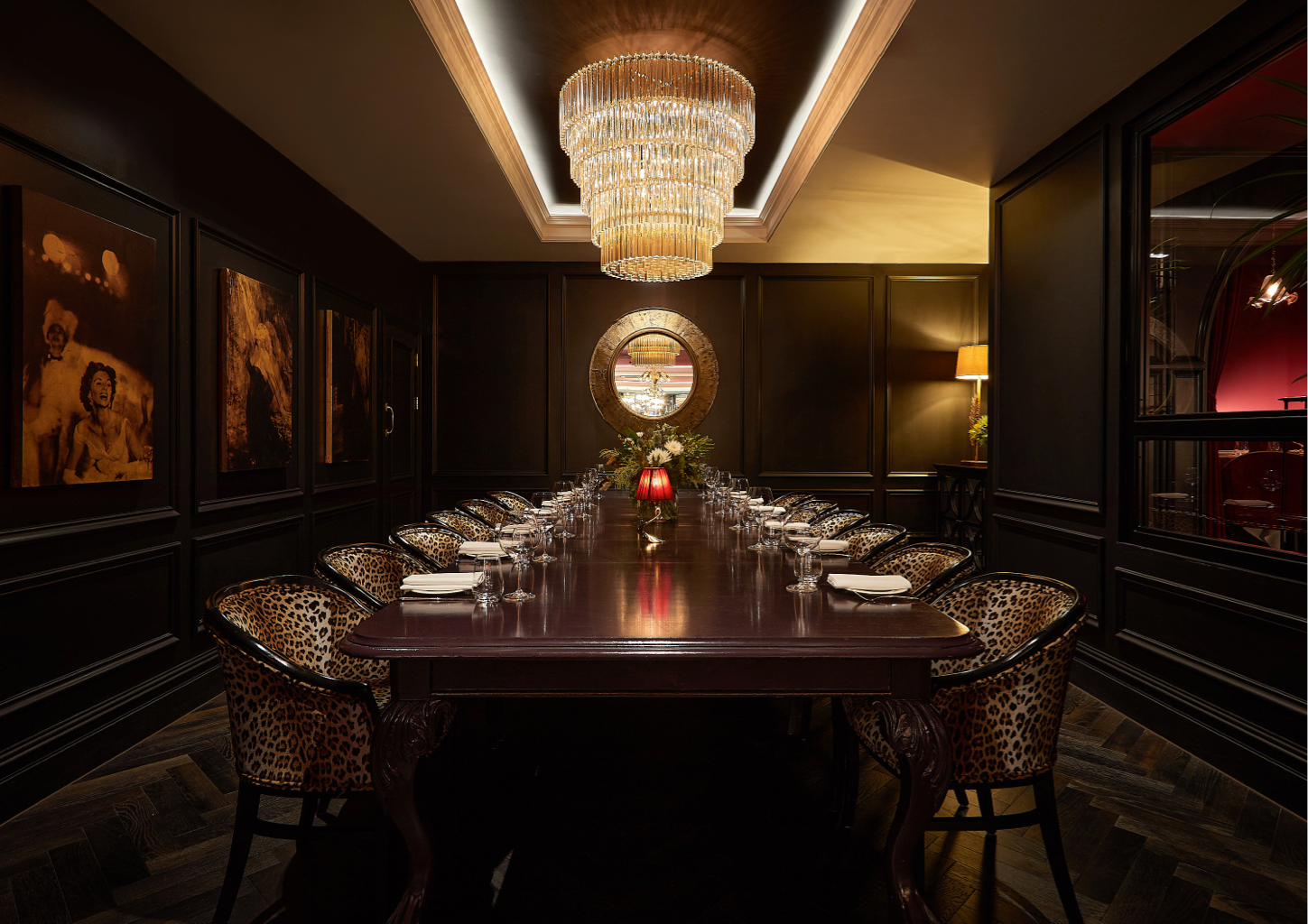 A richly appointed space featuring dark-wood panelling and a dazzling chandelier that sets the tone for any unforgettable occasion. Perfect for up to 16 guests seated or 30 standing, every element can be tailored to create a truly bespoke and memorable event.